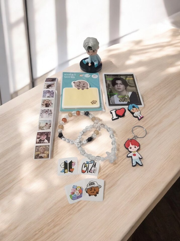 BTS sticker seti 2 adet bileklik 1 adet Süha anahtarlık 1 adet suga figür 1 adet suga hologramli kart 1 adet suga yapışkanlı notluk 2 adet suga terlik crocs süsü