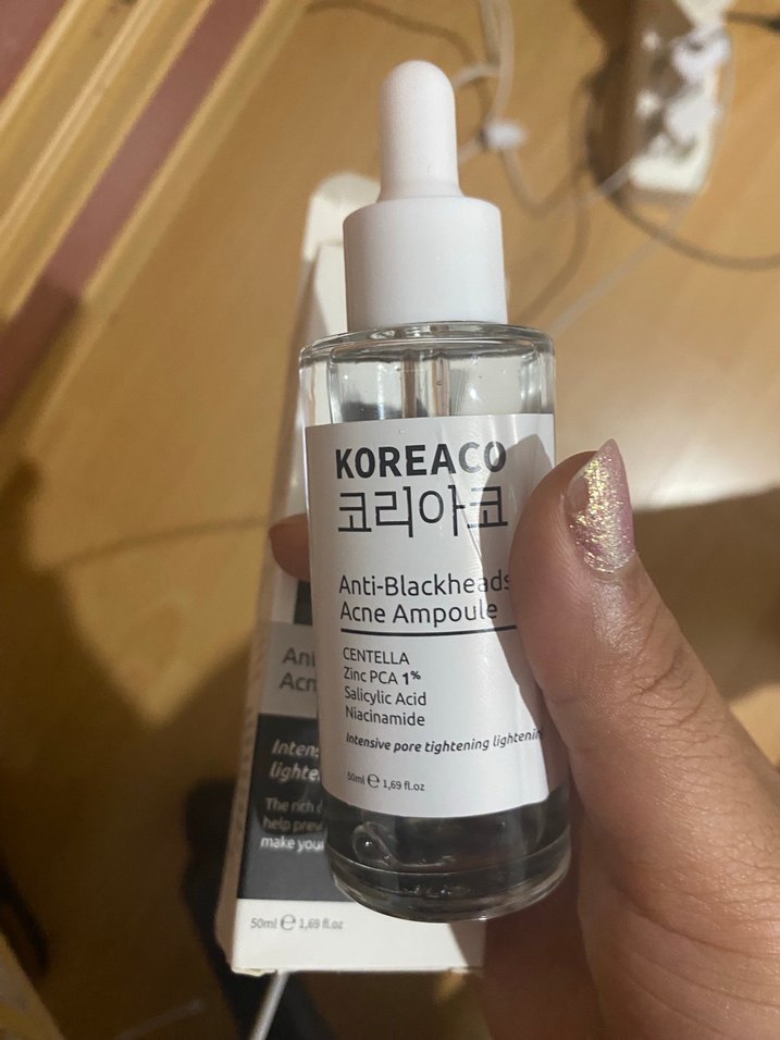 Koreaco Anti-Siyah Nokta ve Akne Ampul, Centella, Çinko PCA, Salisilik Asit ve Niasinamid içerir, siyah noktaları ve akneyi azaltmaya yardımcı olur ve cildi aydınlatır.