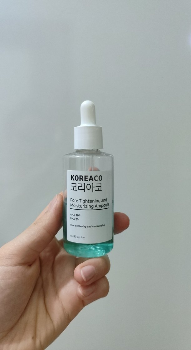Koreaco serumu, AHA %10 ve BHA %2 içeriği ile gözenekleri sıkılaştırır ve cildi nemlendirir.