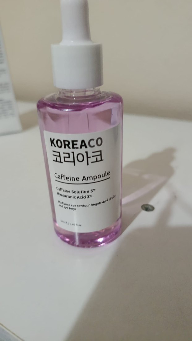 Koreaco Kafein Ampulü, koyu halkaları azaltan ve göz çevresini hedef alan Kafein Solüsyonu %5 ve Hyaluronik Asit %2 içerir. 50ml şişede damlalıklı.