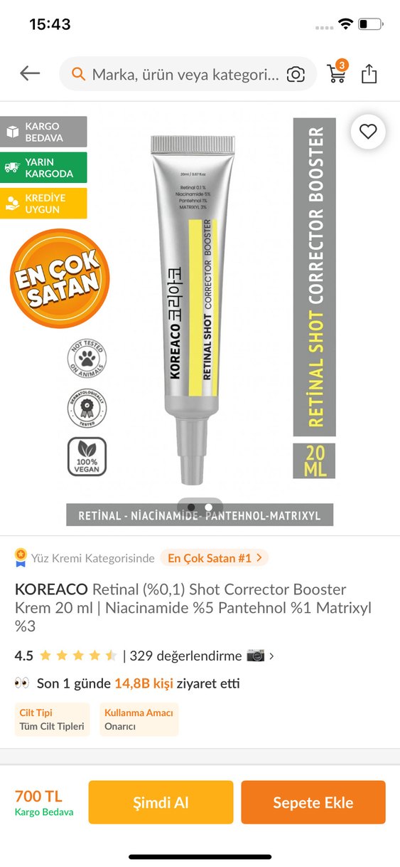 KOREACO Retinal Shot Corrector Booster, %0,1 retinal, %5 niacinamide, %1 panthenol ve matrixyl içerir. 20ml tüpte, vegan dostu bir cilt düzeltici kremdir.