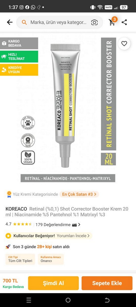 KOREACO Retinal Shot Corrector Booster Krem, %0.1 retinal, %5 niacinamide, %1 panthenol ve %3 matrixyl içerir. Yüz kremi kategorisinde çok satanlar arasında. ürünler sıfırdır orijinaldir. aldığınız gibi kargoya verilir