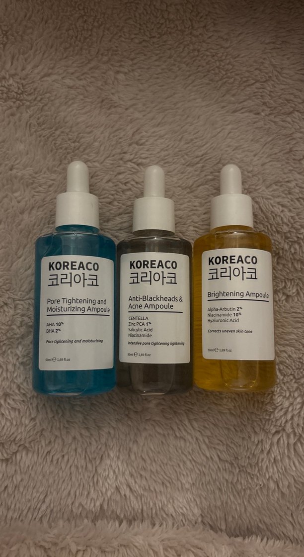 Bu Koreaco serum seti, gözenek sıkılaştırıcı ve nemlendirici, siyah nokta ve akne karşıtı centella ve salisilik asit içeren, ayrıca aydınlatıcı alpha-arbutin ve hyaluronik asit içeren ampullerden oluşur. Üçlü set olarak veriyorum.