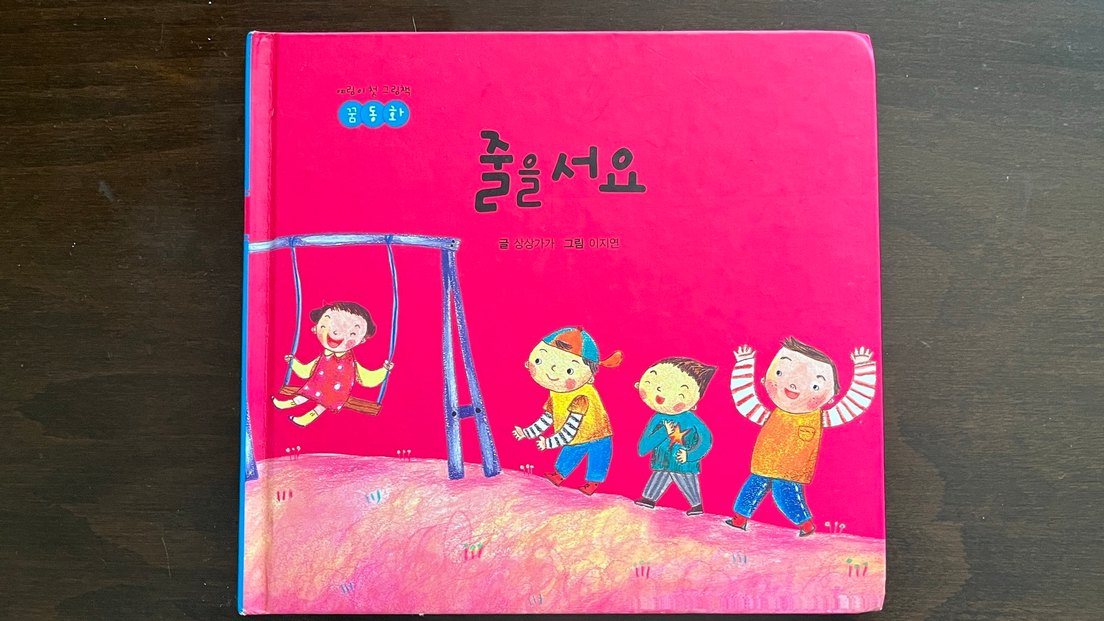 '줄을 서요' adlı çocuk kitabı, salıncakta oynayan çocukların renkli çizimleriyle dolu. Yeni Korece öğrenenler için uygun. Tüm sayfalar sert kartonlu