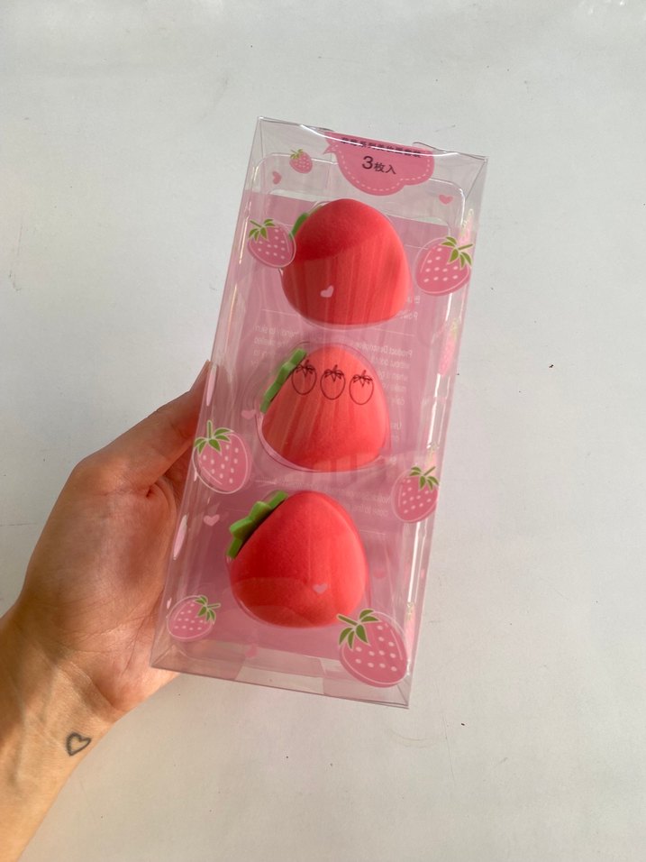 Çilek desenli, pastel pembe renkte 3'lü makyaj süngeri seti, pürüzsüz fondöten uygulaması sağlar. KOREDEN GELMİŞTİR