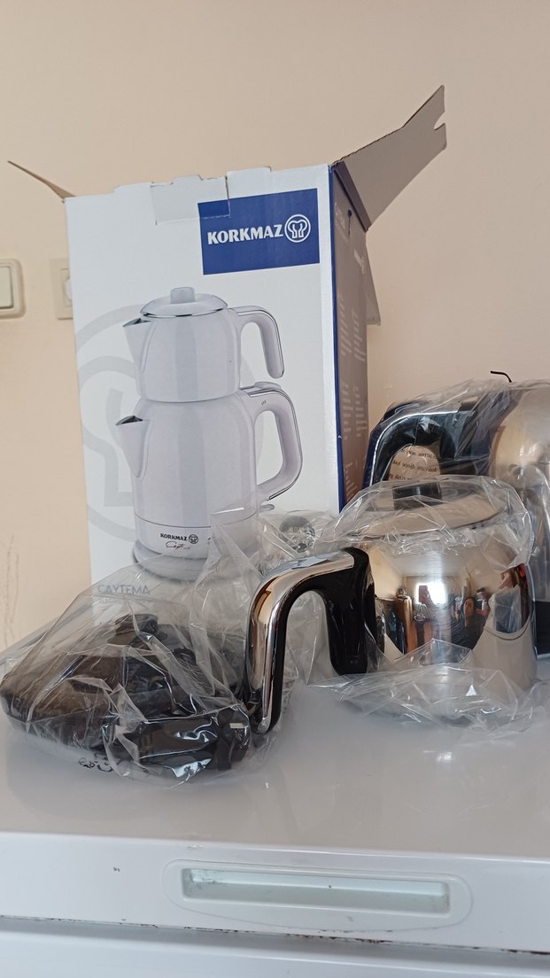 Korkmaz çay makinesi seti siyah ve gümüş renkte, dayanıklı saplar ve paslanmaz çelik parçalarla çay demlemeye uygundur. ☕
