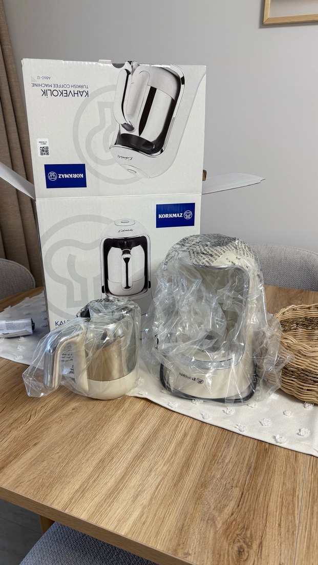 Korkmaz kahve makinesi gri ve beyaz renkte, paslanmaz çelik cezve ve şeffaf plastik kulpa sahiptir. Pratik kahve demleme sunar. ☕