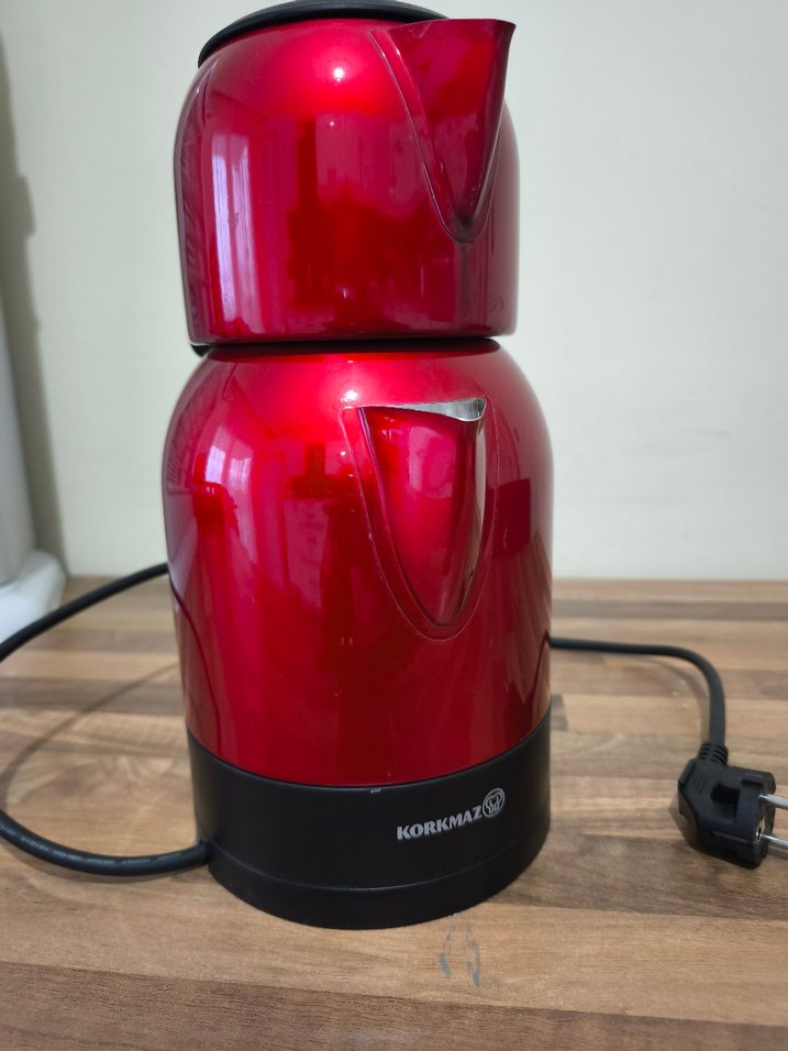 Korkmaz marka, canlı kırmızı renkte, kolay kullanım için kompakt tasarımlı çay makinesi. Üst kısmı demleme, alt kısmı sıcak su için ayrılmıştır. ☕️