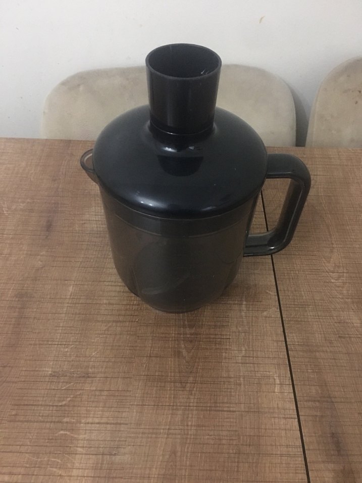 Siyah plastik blender haznesi, tutma sapı ve geniş besleme ağzıyla kolay kullanım sağlar. Standart blender tabanlarına uyumludur.