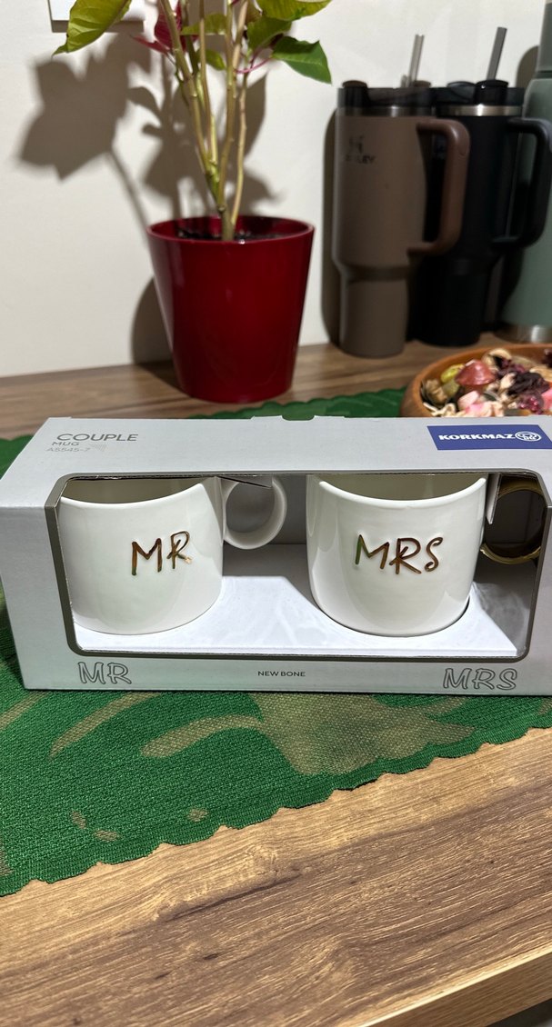 Korkmaz "MR" ve "MRS" yazılı beyaz seramikten yapılmış, çiftlere uygun iki kupa seti. Kulpları rahat ve yüzeyi pürüzsüzdür. ☕ Sıfır ürün, orjinal kutulu.