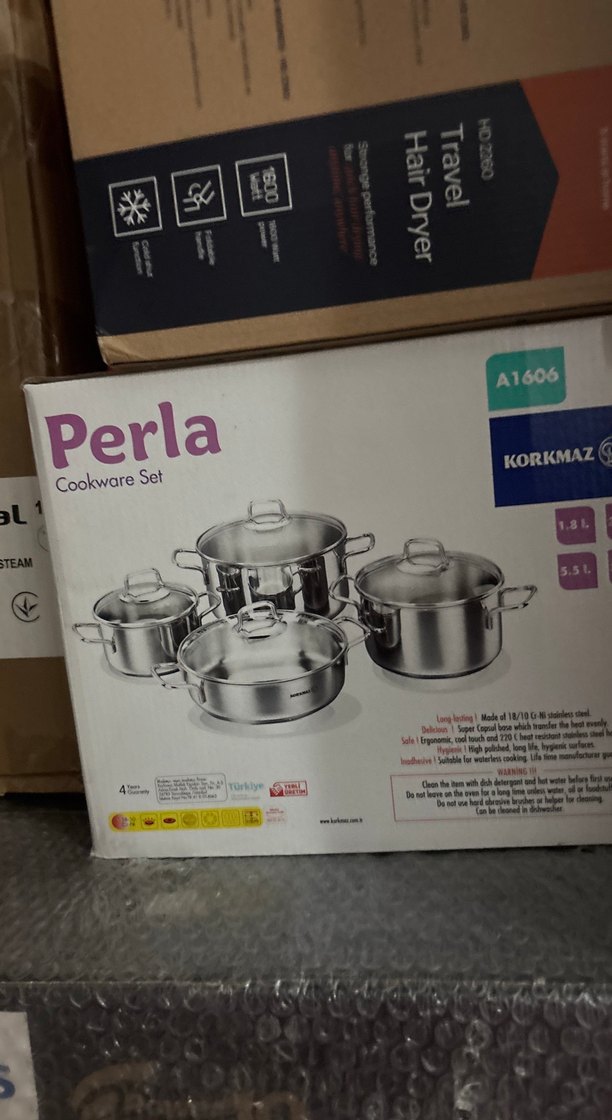 Korkmaz Perla Tencere Seti, 1.8L'den 5.5L'ye kadar cam kapaklı, gri renkli 4 tencere içerir, farklı pişirme ihtiyaçlarına uygundur. Hiç kullanılmadı