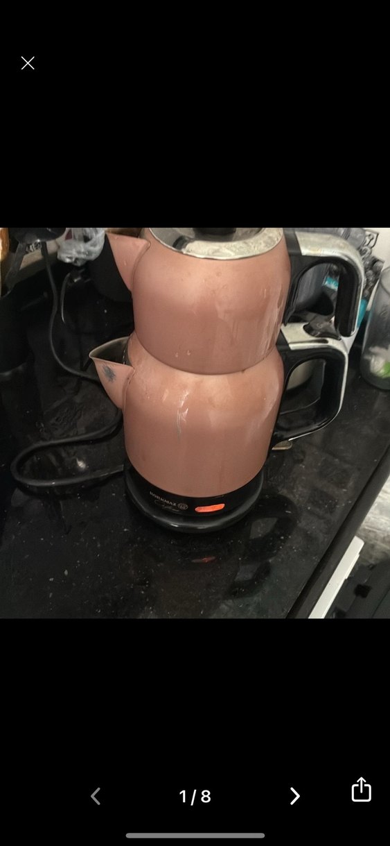 Kahverengi ve siyah saplı, üst üste yerleştirilmiş iki parçadan oluşan elektrikli çaydanlık seti. Kattle , soyulmaları var 7. Görselde de mevcut üst sapta erime var ışıkları görselde çalışır sorunsuz ısıtır kaynatır