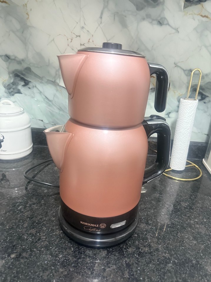 Rose gold renkte, siyah saplı elektrikli iki parçalı çay makinesi. Pürüzsüz yüzeyli ve kolay kullanım sağlar. Kutusu yoktur