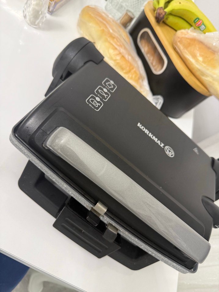 Korkmaz siyah ve gri renklerde, sağlam tutma sapı ve kompakt tasarıma sahip tost makinesi. 1,2 kere kullanıldı yeni hibi