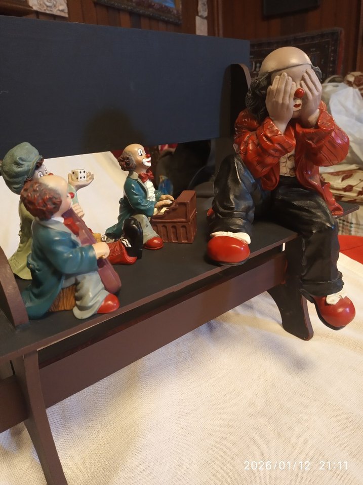 Korkmuş palyaçoyu, teselli eden müzisyenler kompozisyonu