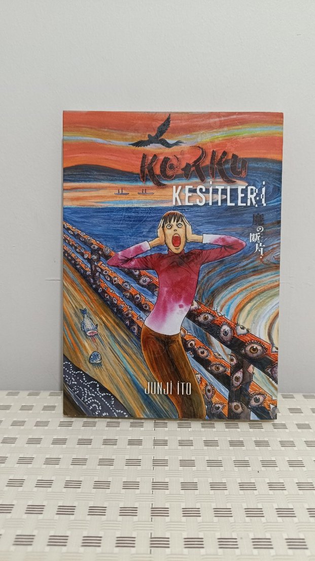 Junji Ito'nun 'Korku Kesitleri' adlı sanat kitabı, korku temalı detaylı ve etkileyici çizimlere sahiptir. Canlı renkler ve dramatik ifadeler içerir. ️