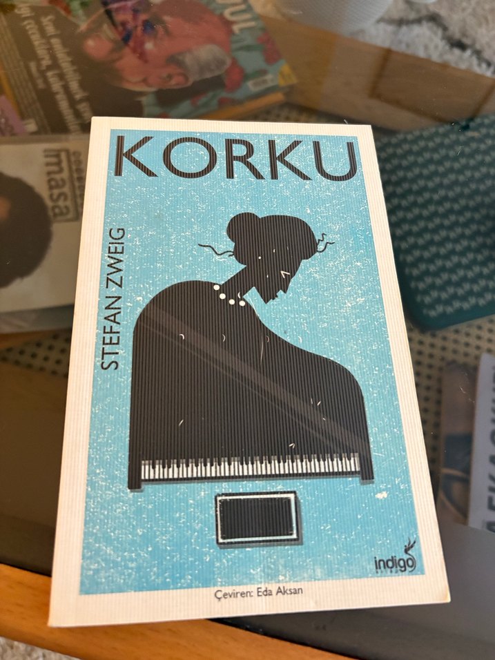 Stefan Zweig'in "Korku" romanı, Eda Aksan çevirisiyle Indigo yayınevi tarafından basılmıştır. Kapakta piyano tuşları ve siluet yer alıyor.
