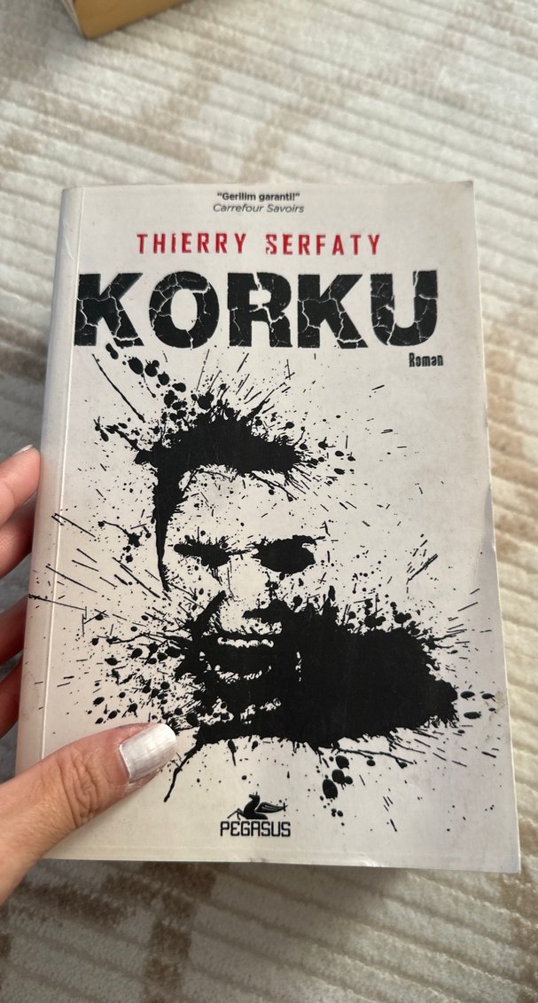 Pegasus yayınevinden Thierry Serfaty'nin "Korku" adlı romanı, kapakta dikkat çekici siyah mürekkep çizimiyle yer alıyor.