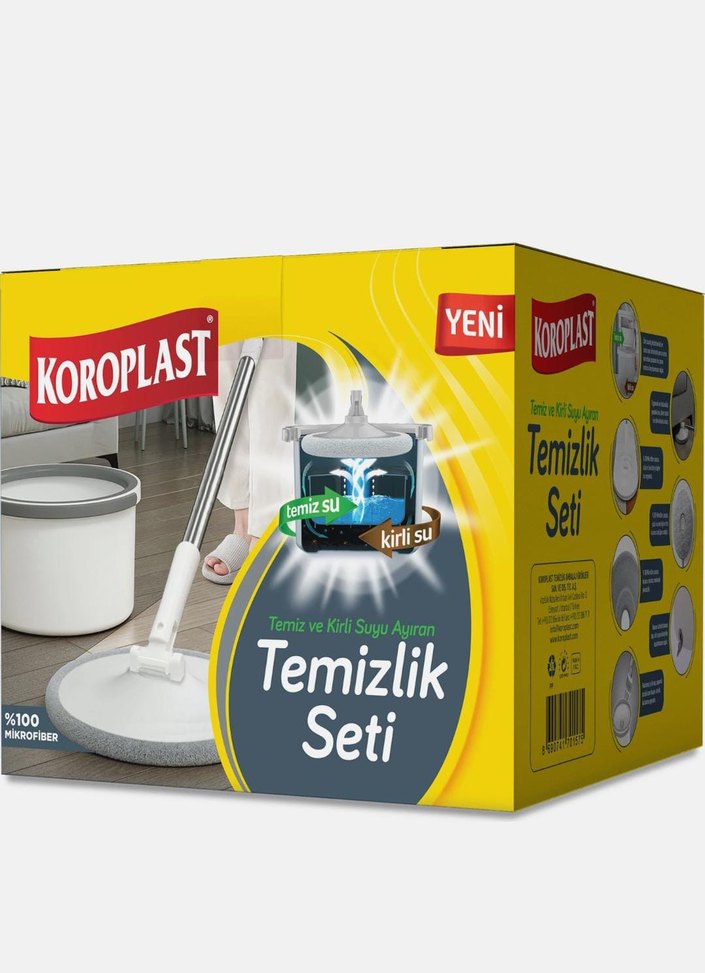 Koroplast temizlik seti, temiz ve kirli suyu ayıran aparatlar ve %100 mikrofiber yumuşak malzeme ile etkili temizlik sağlar.
