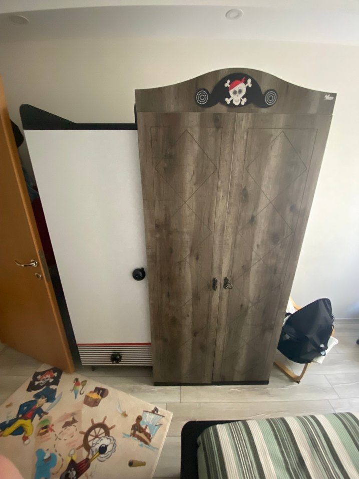 Kahverengi çocuk dolabı, üst kısmında korsan temasıyla iki kapılı ve sağlam yapıda. Çocuk odasında düzen için uygun. Çalışma masası ve birleşik dolap ve karyola YATAK HARİÇ pazarlık payı var nakliye ve taşıma alıcıya ait İZMİR İÇİ