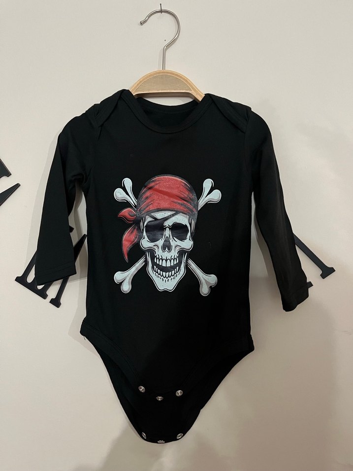 6-9 Ay Siyah uzun kollu bebek body, korsan kafatası baskılı ve kolay giydirme için düğmeli. Rahat crew yaka tasarımı. ☠️