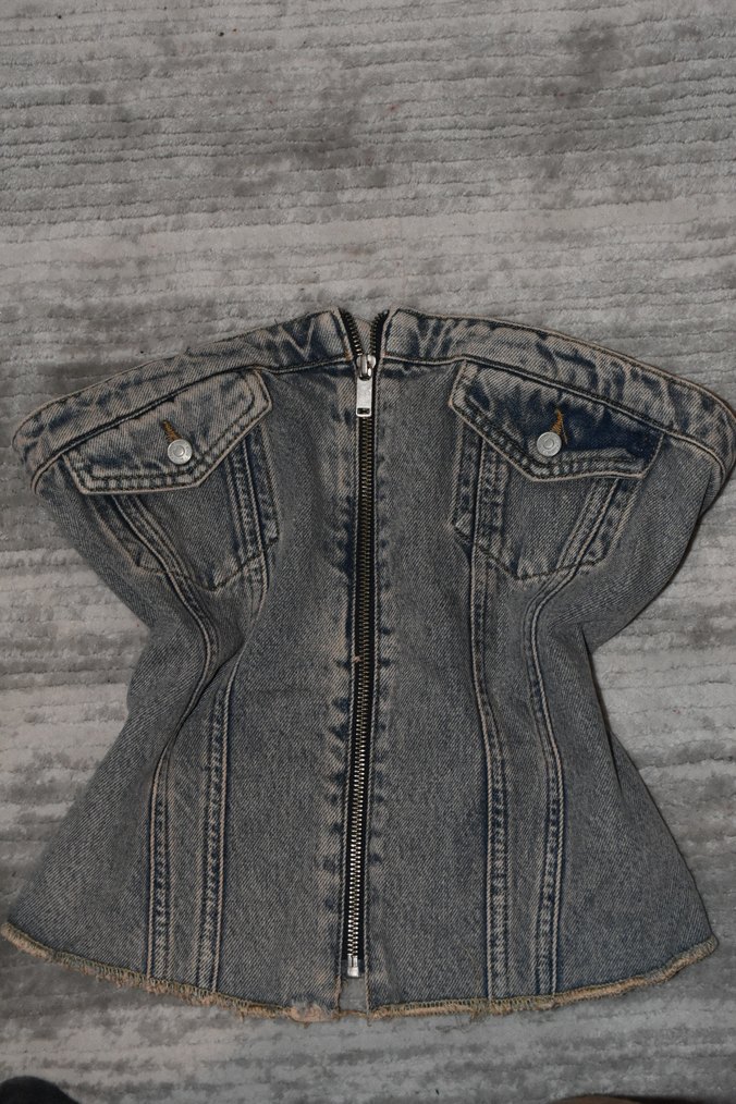 Gri denimden yapılmış, straplez yakalı ve fermuarlı, normal midi boyda, kolsuz, sokak modasına uygun kadın büstiyeri