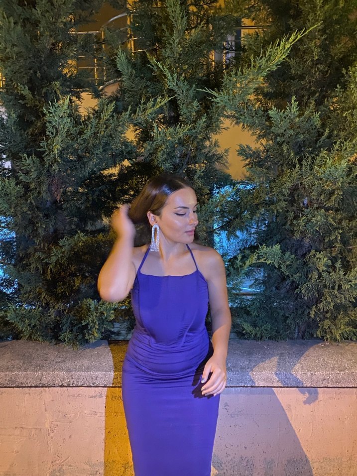 Mor renkli, drapeli ve ince askılı uzun abiye elbise, vücuda oturan kesimi ile dikkat çekiyor. Gösterişli ve cesur parti kombinlerine uygun. 1-2 saat nişanda giymiştim dolabımı boşalttığım için satışta