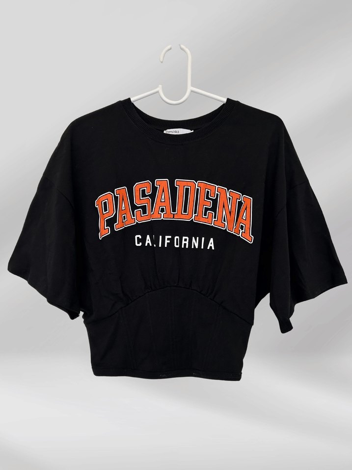 Pamuklu siyah tişört, kısa kollu, yuvarlak yakalı ve bol kesimdir. Üzerinde 'Pasadena California' baskısı ve kısa boyu vardır, rahat athleisure tarzına uygundur.