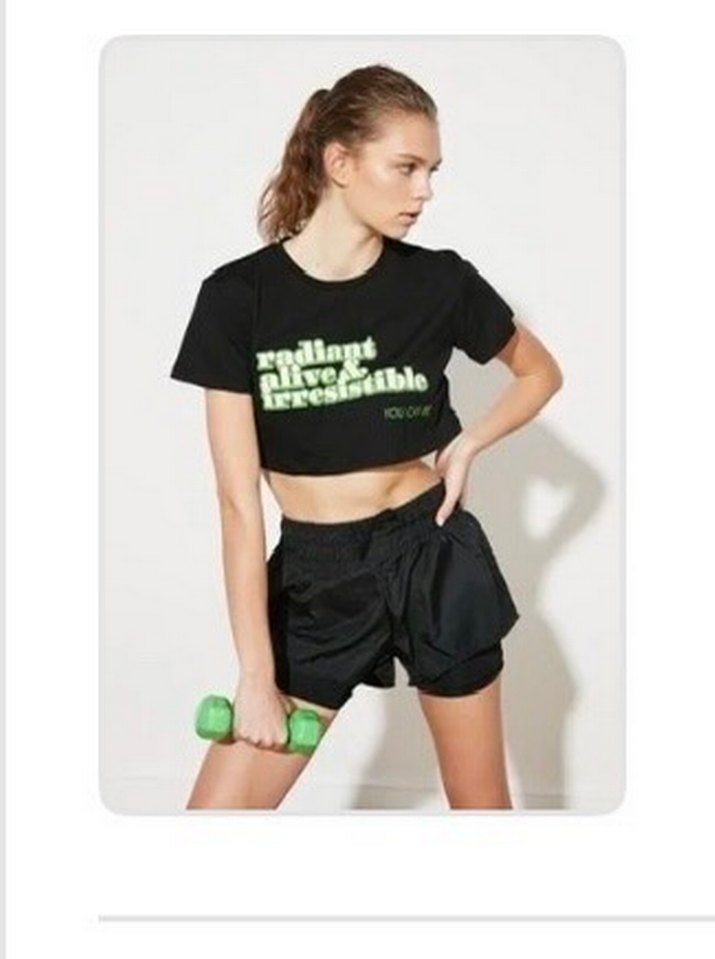 Siyah baskılı crop tişört, kısa kollu ve yuvarlak yaka, pamuklu rahat kumaşla sportif ve sokak tarzı için uygun.
