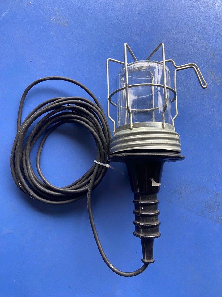 Koruyucu metal kafesli ve uzun siyah kablolu el lambasıdır. Lamba gri metal kafes ve siyah tutamağa sahiptir. Almanyadan gelme seyyar lamba