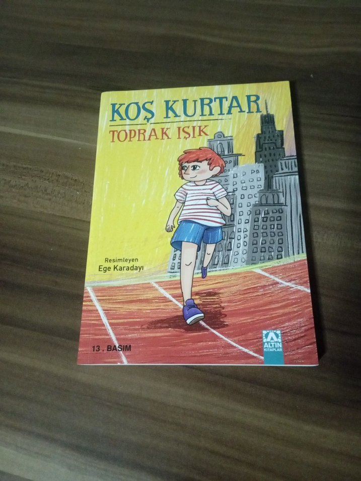 Toprak Işık'ın yazdığı ve Ege Karaday'ın resimlediği "Koş Kurtar" çocuk kitabında, şehir manzarası önünde koşan bir çocuk yer alıyor.