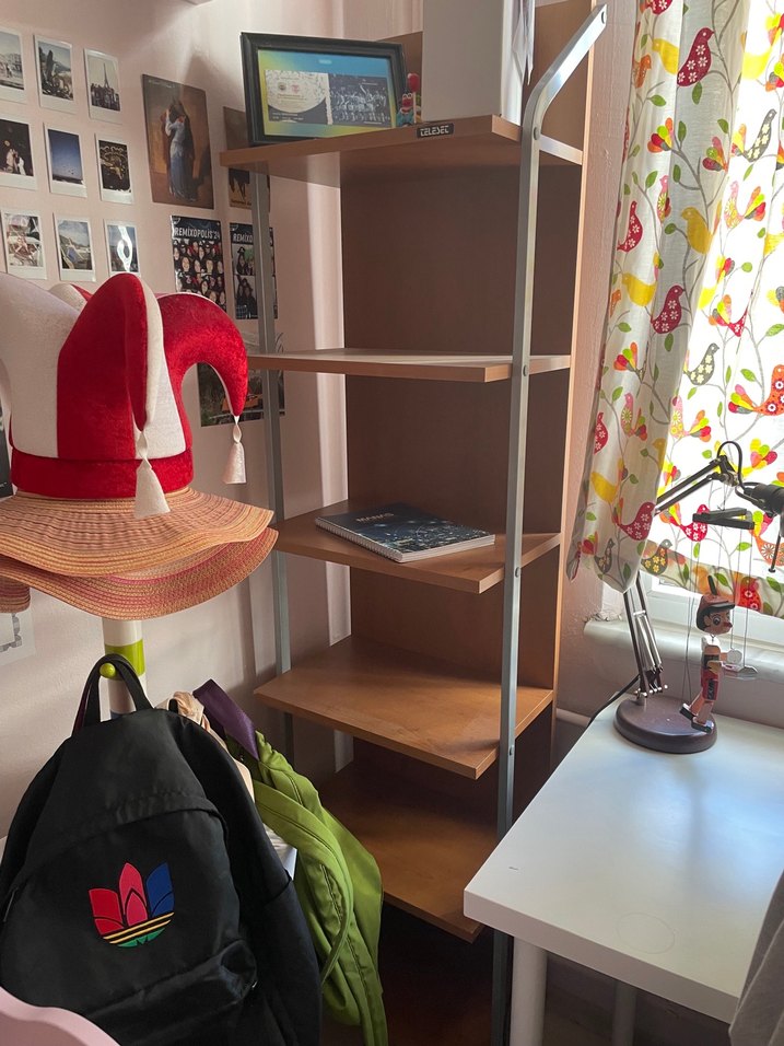 Köşeye yerleşen, gri çerçeveli ve kırmızı detaylı, çok katlı ahşap raflı çocuk rafı.
