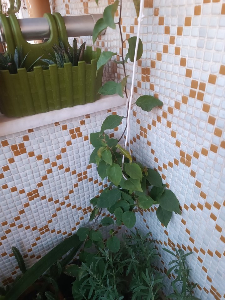 Köşeye yerleştirilmiş, açık yeşil yapraklı sarmaşık bitkisi ve yeşil saksıda küçük bitkiler bulunuyor. Arka planda beyaz-turuncu desenli fayans var.