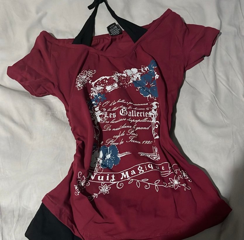 Bordo renkli, baskılı ve kısa kollu hamile tişörtü, straplez yakaya sahiptir. Normal midi boyda, gotik tarzda ve Paris etkisiyle tasarlanmıştır. Romantik akşamlar için uygundur.