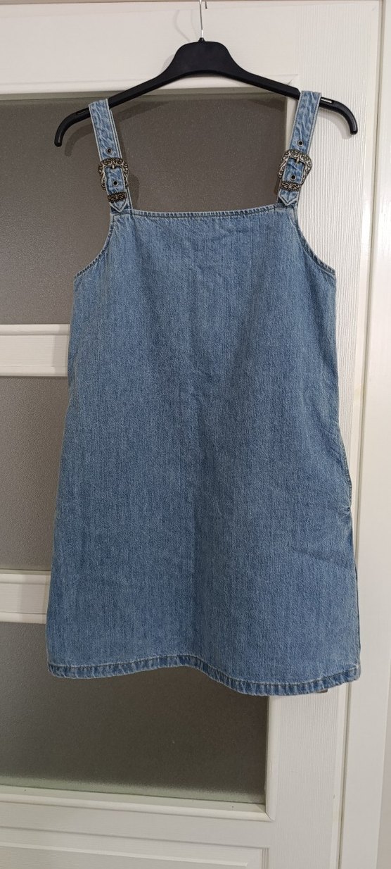 kadin kot kumaştan, askılı ve tokalı, salaş kesim elbise. Düz mavi-gri renkte, sade normcore tarzda.