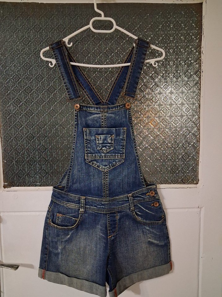 Kızlar için kot kumaştan, askılı ve tokalı şort tulum. Mavi tie-dye deseni ve önde cep bulunur. Sokak tarzı için uygundur.