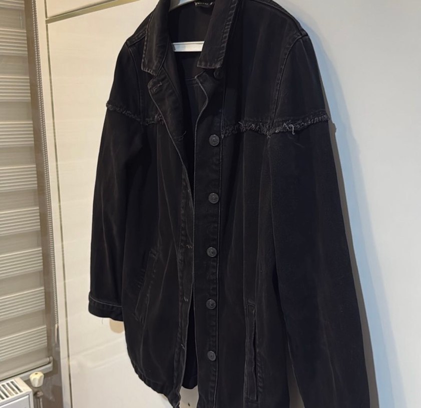 Siyah denim kumaştan, düğmeli ve yakası kesikli salaş kesim uzun kollu ceket. Günlük kullanıma uygun rahat bir tarz sunar.