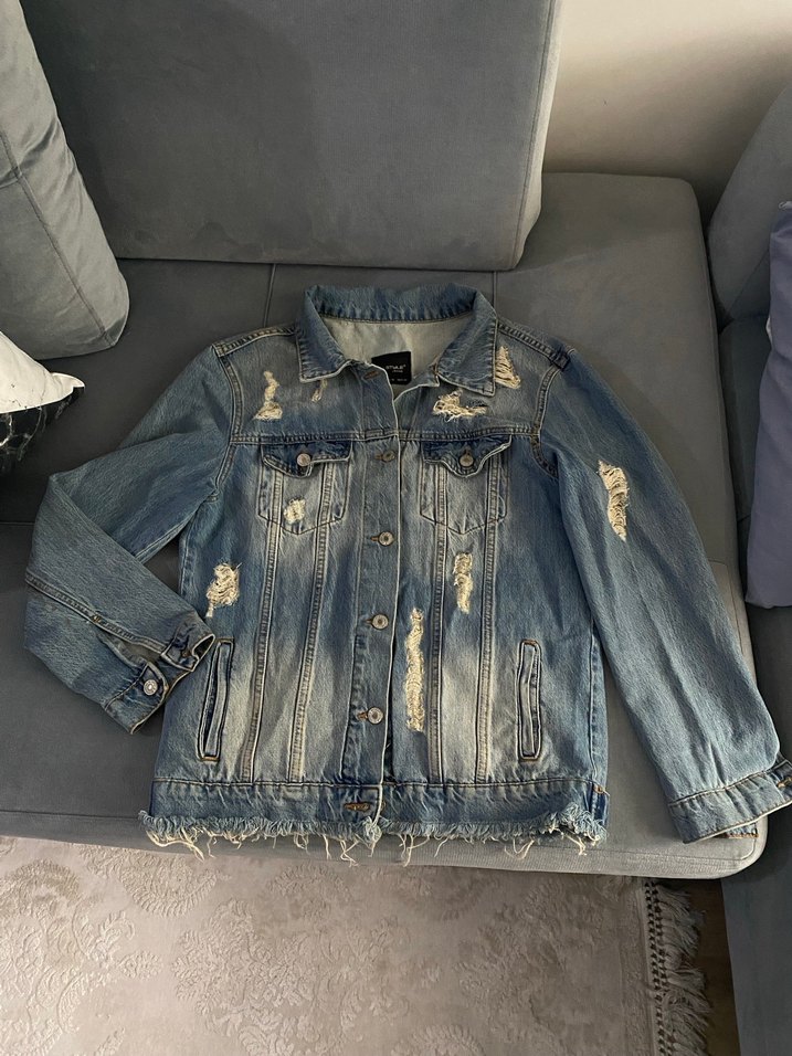 Düğmeli, mavi denim ceket. Uzun kollu, yakası kesik ve normal boyda. Yıpranmış detaylarıyla sokak stiline uygundur. Tam 40 beden