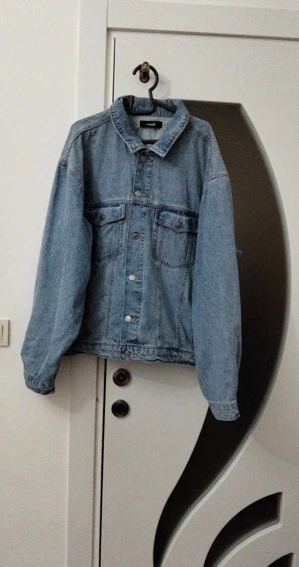 Düğmeli, uzun kollu, yakalı ve bol kesim gri mavi kadın denim ceket. Günlük sokak stili için uygun, desen içermeyen normal boyda bir parça. temiz kullanıldı kusuru yok