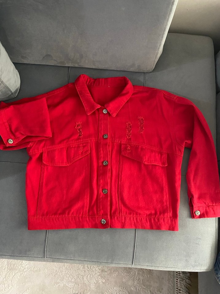 Düğmeli ön kısmı, uzun kollu ve kesik yaka detaylı kırmızı kot ceket. Bol kesim ve normal boy. L beden oversize seviyorsanız M bedenede olur. Ufak bi lekesi var yıkamadım yıkanınca çıkar.