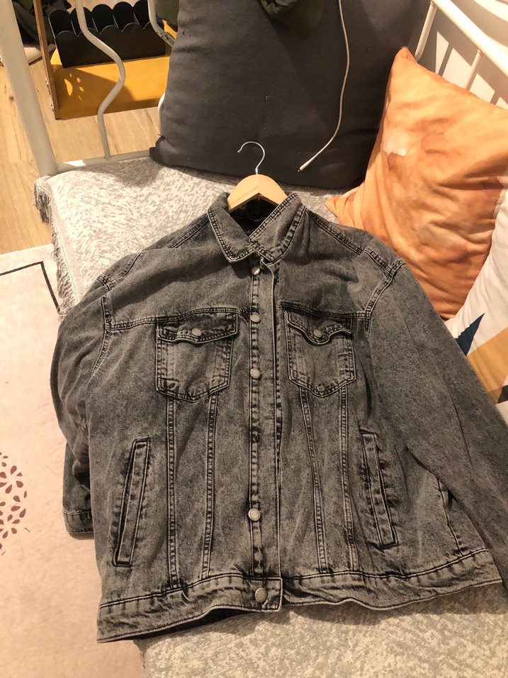 Gri renkli, düğmeli, uzun kollu ve bol kesim kadın denim ceket. İki göğüs cebine sahip, günlük sokak modasına uygun bir parça.