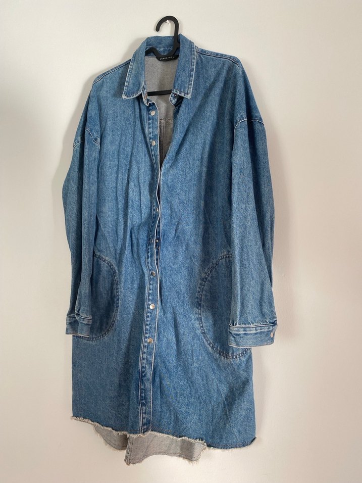 Düğmeli, uzun kollu, kesik yaka mavi denim ceket. Rahat kesimiyle günlük sokak stiline uygundur.