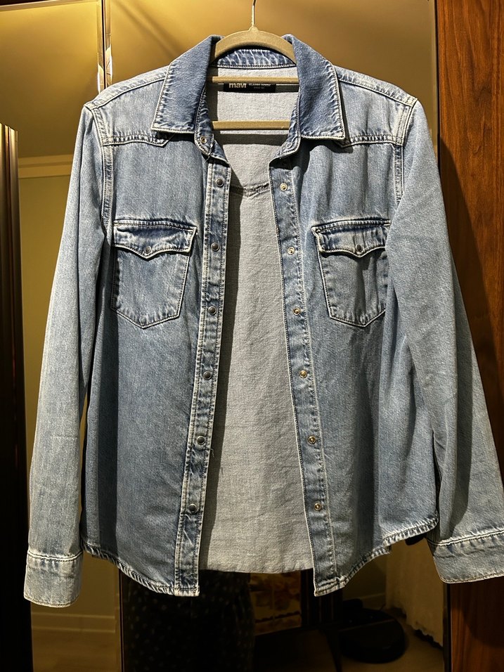 mavi kot ceket, uzun kollu ve ön kapamalıdır. ve göğüs cepleri bulunur, günlük kullanıma uygundur.