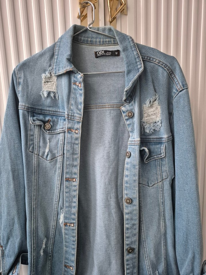 Düğmeli ön ve uzun kollu, bol kesim kadın mavi denim ceket. Normal boyda, yırtık detaylı, günlük kullanıma uygun rahat sokak stili.