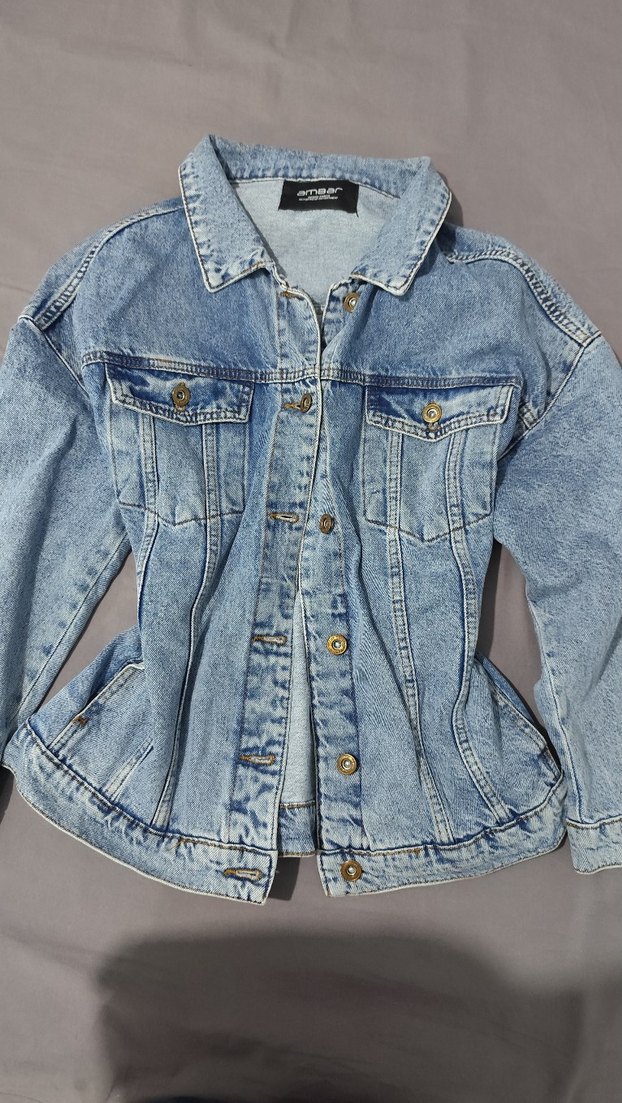 Düğmeli, notched lapel yakalı ve uzun kollu kadın denim ceketi. mavi renkte, bol kesim ve midi boyda, günlük rahat kullanıma uygun. ambardan almistim
