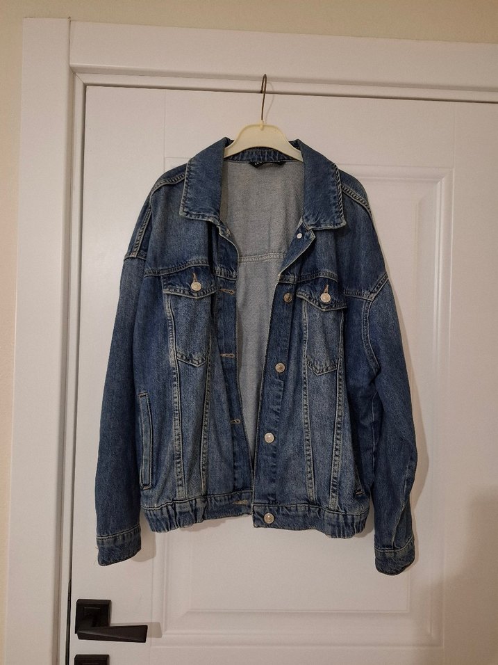 Kadınlar için gevşek kesim, düğmeli mavi denim ceket. Notlu yakalı, uzun kollu ve normal uzunlukta, günlük rahat kullanım için uygundur. Ufak bir defosu dışında bir şey yok fotoğrafa ekledim zaten. Oversize bir kalıbı var.