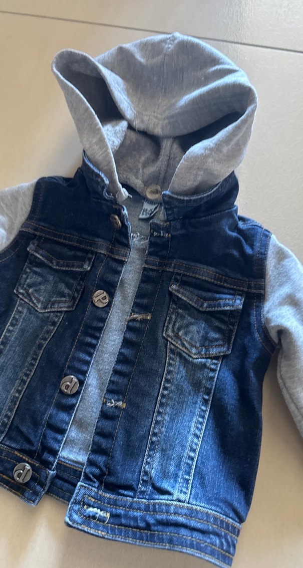 Gri kapüşonlu kapsonu dilersenız cıkabılen düğmeli denim ceket. 6-12 ay için uyumlu sıfırdan farksız tertemız ürün