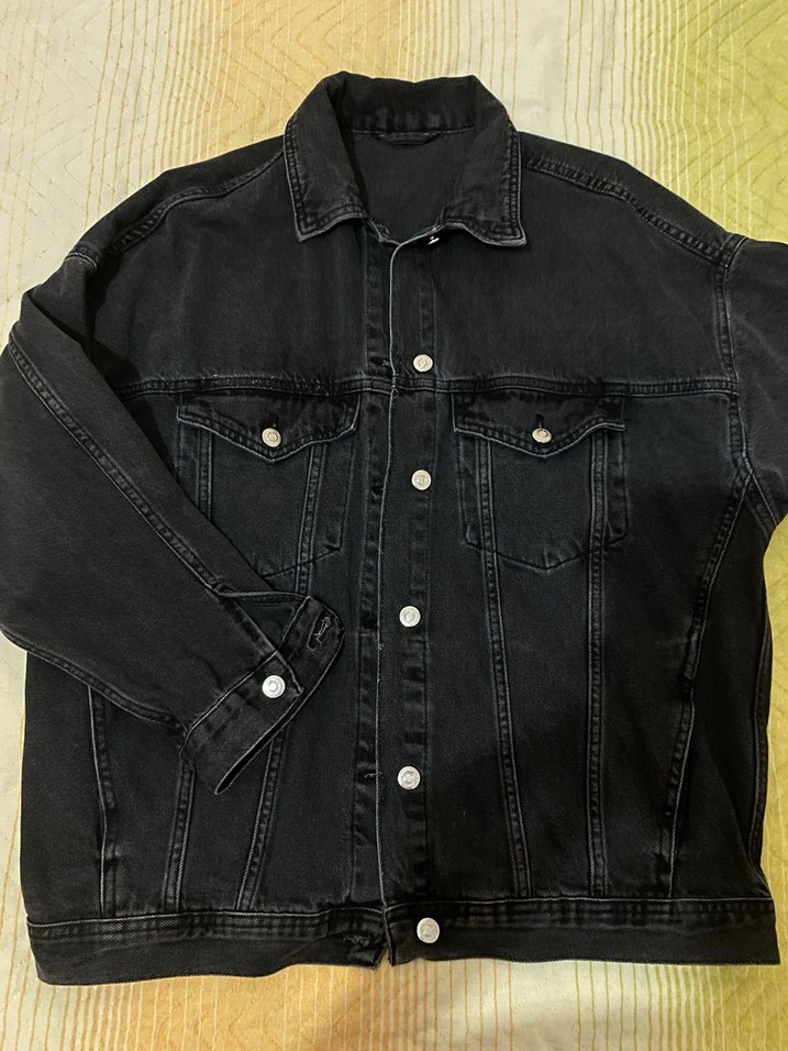 Düğmeli önü, bol kesim ve uzun kollu siyah denim ceket. Notlu yaka ve günlük kullanıma uygun rahat sokak stili. Stradivarius kot ceket, kolundaki hafif aşınmayı çektim görsellerde. Stradivarius koton mango zara suud collection manuka lcw