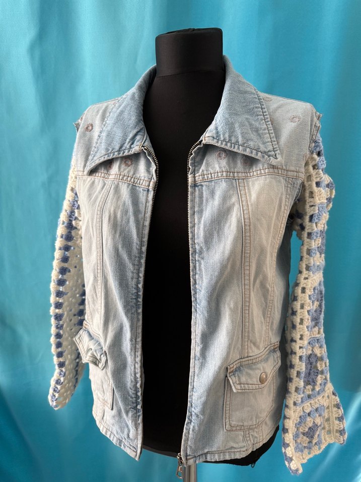 Düğmeli ön, kesik yaka ve uzun kolları örgü desenli kadın mavi kot ceket. Gevşek kesim, pastel mavi ve batik detaylı, günlük sokak stili için uygun. Geri dönüştürülmüş el yapımıdır M/L beden