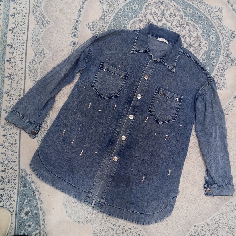 Mavi denimden, uzun kollu ve düğmeli, taş işlemeli detaylara sahip bol kesim ceket. Günlük rahat sokak stili için uygundur. ✨
